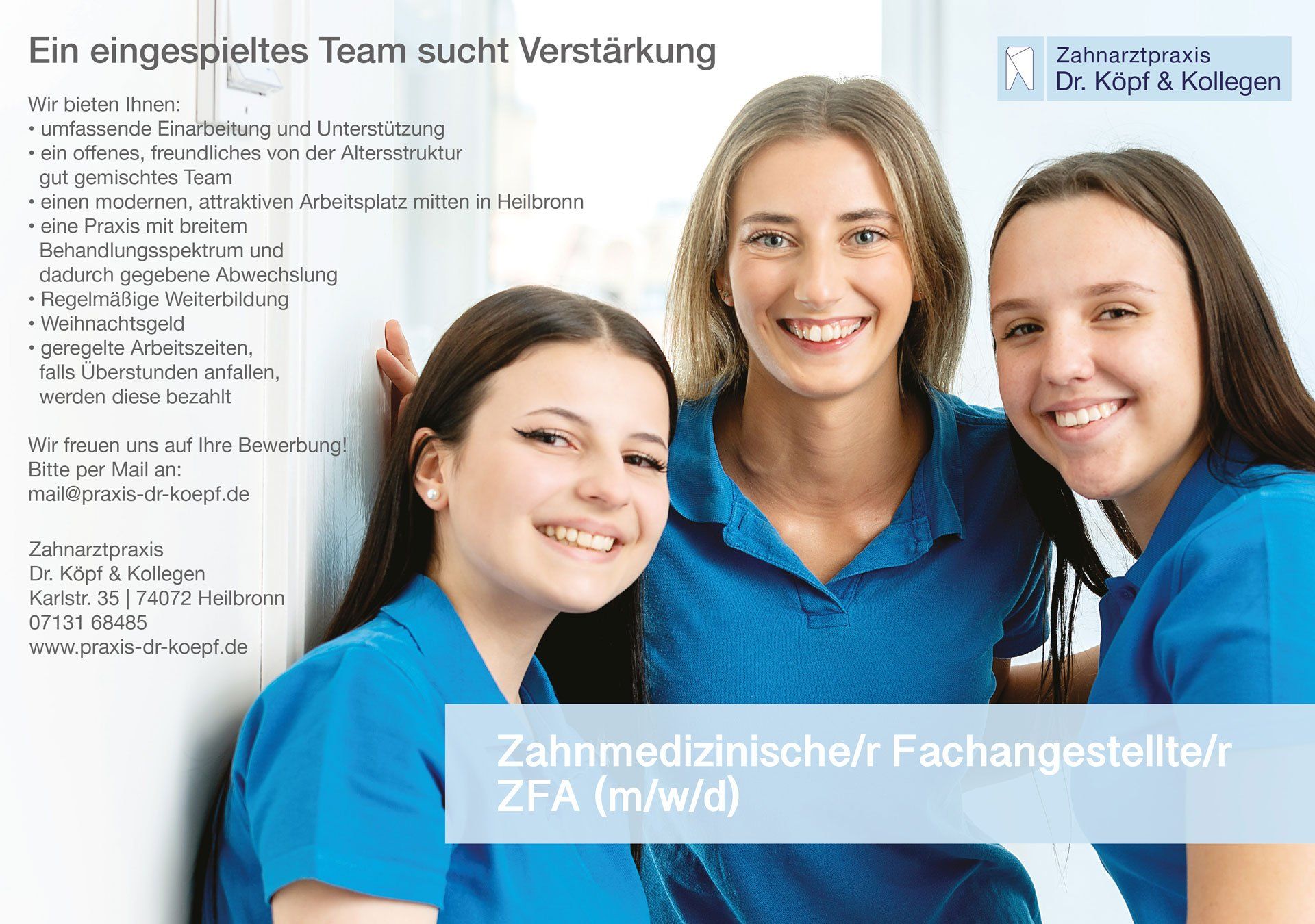 Auch dieses Jahr suchen wir wieder eine/n zuverlässige/n Auszubildende/n, die/der Lust hat einen abwechslungsreichen Beruf zu erlernen. Schon seit vielen Jahren bilden wir in unserer Zahnarztpraxis zur Zahnmedizinischen Fachangestellten aus. Wir freuen uns sehr darüber, dass mehrere langjährige Angestellte bereits ihre Ausbildung bei uns in der Praxis gemacht haben. An einer Übernahme nach der Ausbildung sind wir bei gegebenen Voraussetzungen absolut interessiert. In unserer Praxis haben Sie die Möglichkeit, dass komplette Spektrum der Zahnmedizin kennenzulernen und somit vielfältige Kenntnisse im Bereich der Zahnmedizin zu erwerben. Es liegt uns am Herzen, dass das Team gut zusammenarbeitet und die Auszubildenden von den erfahrenen Mitarbeiterinnen/Mitarbeitern lernen und eine gegenseitige Unterstützung und Wertschätzung erfolgt. Möchten Sie den Beruf der/des Zahnmedizinischen Fachangestellten erlernen und eine abwechslungsreiche Ausbildung in einem tollen Team mitten in Heilbronn beginnen? Dann senden Sie uns Ihre Bewerbungsunterlagen an: mail@praxis-dr-koepf.de